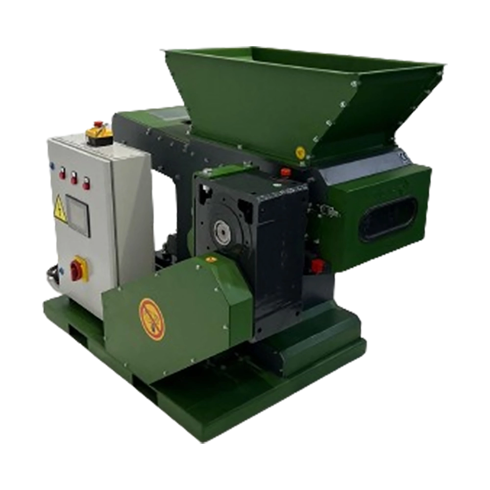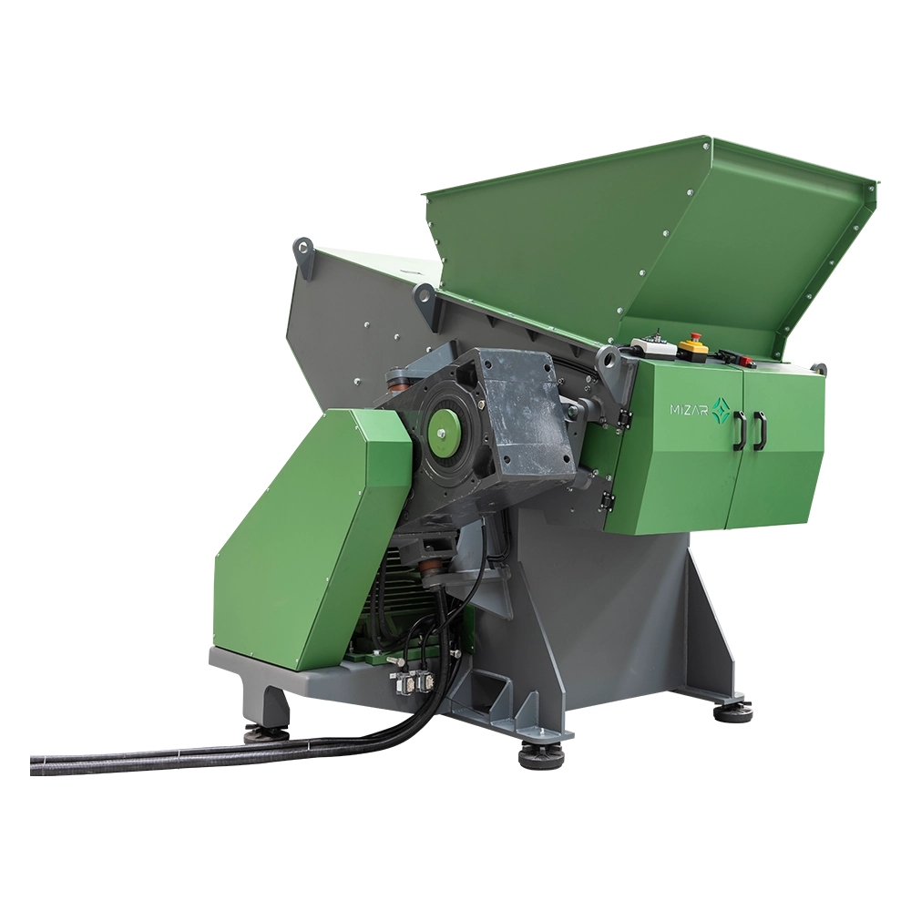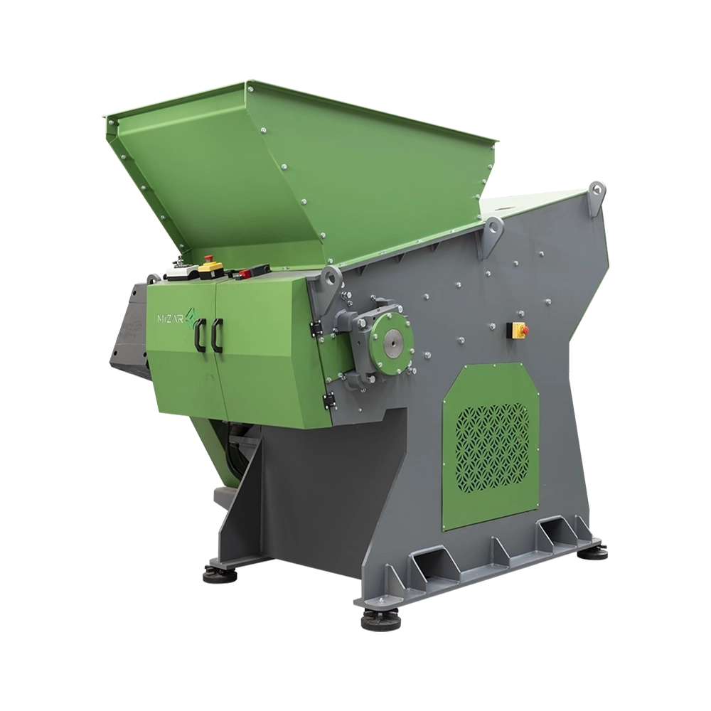 The SSH Series shredders are designed to efficiently shred various wastes such as cables, radiators, electronic boards, wood, plastics, and tires using customized blades on a single rotating shaft. A programmable hydraulic pusher ensures continuous feeding of the rotor. In case of a jam, the rotor reverses direction, allowing the cutting process to continue uninterrupted.
